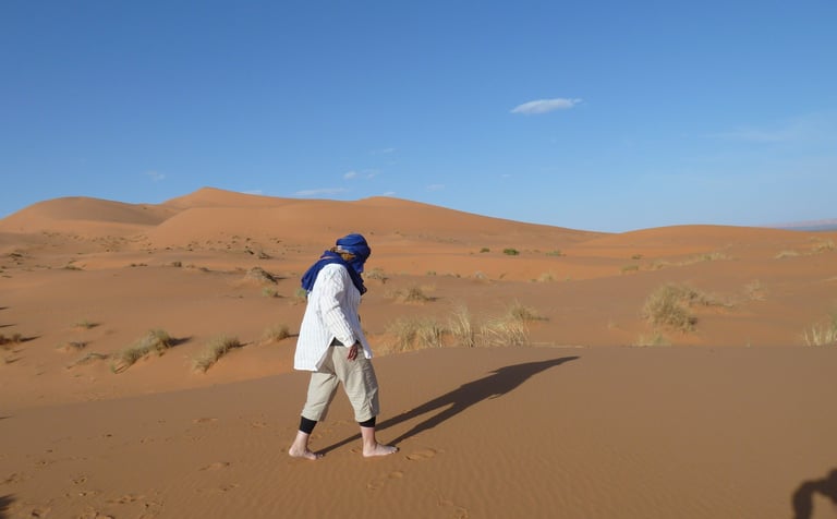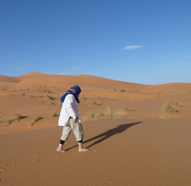 In a remote area in the south of Morocco, I felt my heart had come home as I discovered the desert. For a week I stayed in a rhiyad (guest house), reached along ancient tracks into the desert, and near a huddle of Berber dwellings. I was given one room in the corner of a spacious rectangular walled compound where I could write, make tea and sleep. In the sandy soil young trees of fig, orange, eucalyptus and almond had been planted to provide shade and shelter.